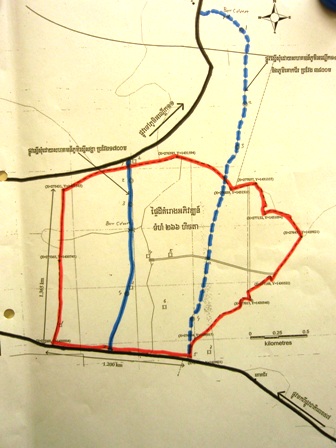 黒 い 線 : 既存の道路 赤 い 線 : 240haの地雷原跡地 青い実線: 1.7km 計画道路 青い点線: 3.4km 計画道路 建設する道路は1.7kmと3.4kmの2本を計画しています。これらの道路は農地を通りまた既存の道路をつなげるもので、道路の完成により3村の間の往来も容易になります。 まず1.7kmの道路建設について、4月に3村長、建設予定地所有者、農村開発局に集合してもらい、道路建設の正式アナウンスをしました。また、建設用地の公有地化の手続きを行いました。