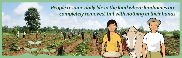 We, GEJ is currently supporting people in Cambodia. We are working with Cambodian Mine Action Centre (CMAC) as a counter partner, and also collaborating with various government offices, NGOs and people living in post-mine-cleared area in order to carry out projects like farmland rehabilitation, Agricultural training and improvement of rural infrastructures.