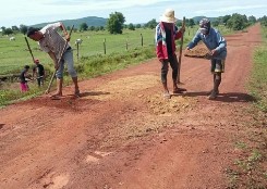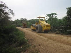 The earth road of 1.1 Km length at Chirok village in Battambang Province northwest of the Kingdom of Cambodia where Good Earth Japan (GEJ) support farmers there have been changed to Laterite surface road. The construction work had started in June but due to the shortage of construction machinery, the completion of the work had been delayed. However, by the end of September, the truck loads of Laterite had been brought in, and the grading and compaction work had been completed finally.