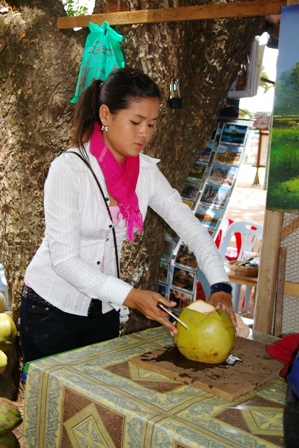 飲むときには、お姉さんがココナッツの実の上部をナタで切ってストローをさしてくれます。